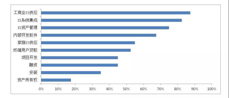 圖3 美國(guó)40個(gè)用戶側(cè)儲(chǔ)能市場(chǎng)參與主體提供的服務(wù)及提供此項(xiàng)服務(wù)的企業(yè)數(shù)量占比