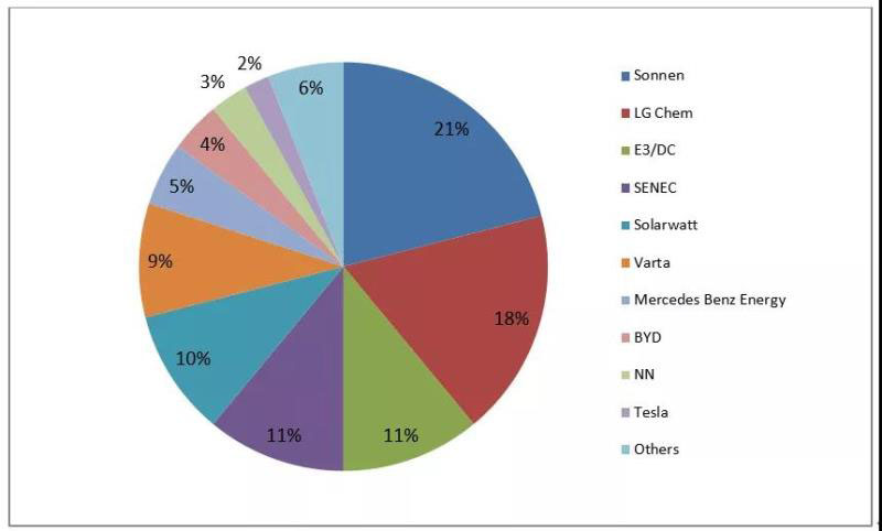 圖4 2017年德國(guó)家用儲(chǔ)能系統(tǒng)市場(chǎng)份額[7]