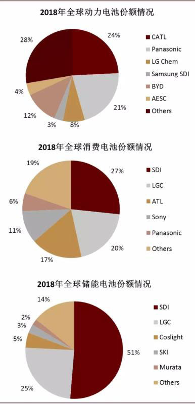 電池各環(huán)節(jié)需求呈多寡頭格局,2018年CATL與松下動力電池裝機領(lǐng)先,三星與LG Chem在消費與儲能領(lǐng)先。從市場份額的角度來看,2018年動力、儲能與消費全球市場來看CR5的市場份額均超過70%,我們認(rèn)為高集中格局不改,但龍頭地位或有變遷。