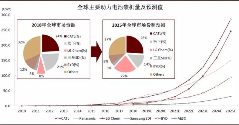 從2017-2018年營收結(jié)構(gòu)來看,三星側(cè)重消費與儲能,LG Chem側(cè)重動力及儲能,松下逐步淡出消費專注動力,CATL則專注動力并拓展儲能。展望2025年,我們認(rèn)為動力領(lǐng)域CATL與LG Chem有望占優(yōu),2025年市場份額可分別達(dá)26%與22%,消費領(lǐng)域三星等繼續(xù)占主導(dǎo)。