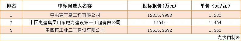 2019年9月28日,新泰朝輝新能源有限公司100MW普通光伏電站競(jìng)價(jià)上網(wǎng)項(xiàng)目工程施工總承包中標(biāo)候選人公示。中電建寧夏工程有限公司以總價(jià)12816.9988萬元,單價(jià)1.282元/瓦,位列第一中標(biāo)候選人。
