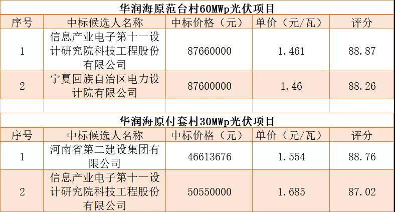 同日,華潤海原范臺(tái)村60MWp光伏項(xiàng)目、付套村30MWp光伏項(xiàng)目?jī)身?xiàng)目分別公示EPC(不含光伏組件采購)中標(biāo)候選人,其中十一科技以總價(jià)87660000、單價(jià)1.461元/瓦成為華潤海原范臺(tái)村60MWp光伏項(xiàng)目EPC第一中標(biāo)候選人,河南省第二建設(shè)集團(tuán)有限公司以總價(jià)46613676元、單價(jià)1.554元/瓦成為華潤海原付套村30MWp光伏項(xiàng)目EPC第一中標(biāo)候選人。