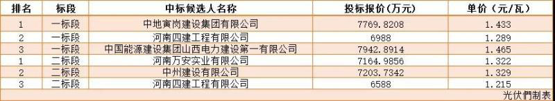 2019年9月26日,蒙能包頭100MWp光伏發(fā)電示范基地平臺(tái)項(xiàng)目光伏區(qū)(一、二標(biāo)段)施工中標(biāo)候選人公示。中地寅崗建設(shè)集團(tuán)有限公司以總價(jià)7769.820800萬元,單價(jià)1.433元/瓦,位列一標(biāo)段第一中標(biāo)候選人。河南萬安實(shí)業(yè)有限公司以總價(jià)7164.985600萬元,單價(jià)1.322元/瓦,位列二標(biāo)段第一中標(biāo)候選人。