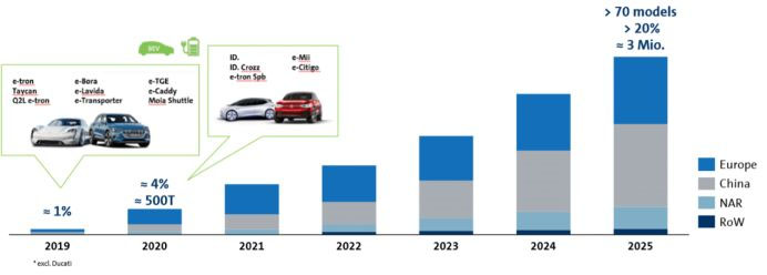 以大眾集團的規(guī)劃為例,2020年新能源產(chǎn)品要做到全部銷量的4%,也就是近50萬臺的量,2021年接近100萬臺的目標,其中有65%是在歐洲,也就是有65萬臺的新能源汽車。