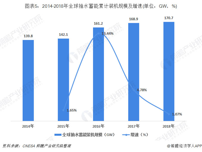 2014-2018年,全球抽水蓄能的裝機(jī)規(guī)模呈遞增趨勢。2018年,全球抽水蓄能累計(jì)裝機(jī)規(guī)模為170.7GW,同比增長1.07%。