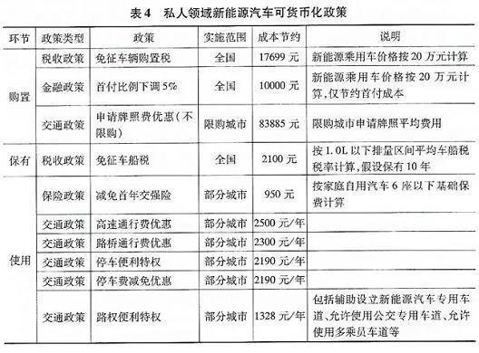 總體來看,目前針對新能源汽車私人領(lǐng)域的支持政策中,購置環(huán)節(jié)的支持力度最大,特別是在限購城市,購置新能源汽車可節(jié)約購置成本超過10萬元(主要是申請牌照節(jié)約成本);保有環(huán)節(jié)因車船稅稅額不高,節(jié)約成本有限;使用環(huán)節(jié)的政策基本集中于交通政策,且均為地方政策,同國家要求地方對新能源汽車支持政策由購置環(huán)節(jié)轉(zhuǎn)向使用環(huán)節(jié)的導(dǎo)向也基本一致(見表4)。