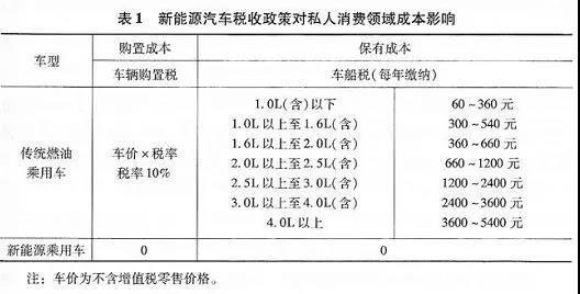 目前,我國已初步建立涉及新能源汽車研發(fā)、生產(chǎn)、購置、保有及使用階段的稅收支持政策。其中,消費者可直接享受的政策有車輛購置稅和車船稅優(yōu)惠政策,這兩項政策可直接降低消費者購置及保有成本。具體成本差異如表1所示。
