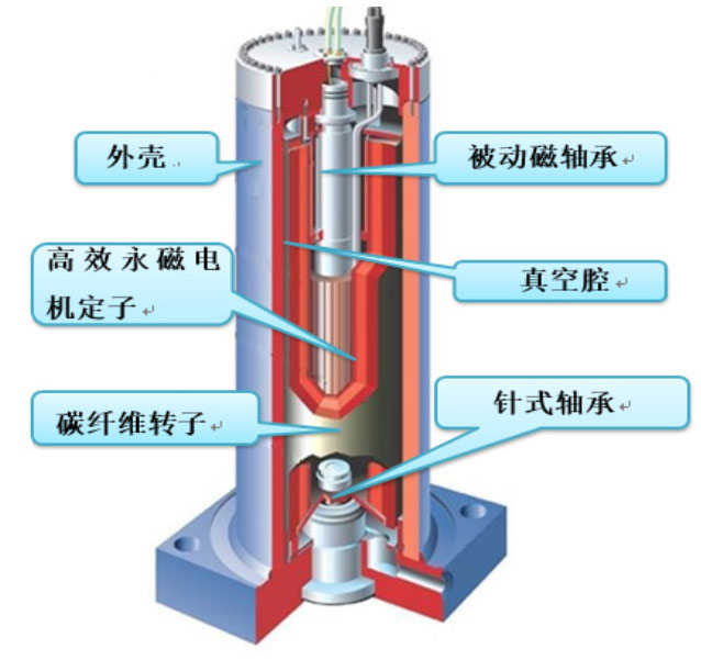 1)被動磁軸承技術:無需電控單元、非接觸、無磨損、免維護、簡單可靠。