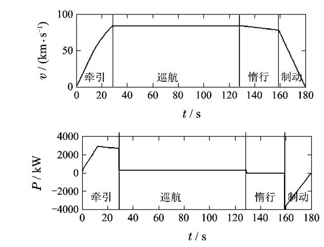 如上圖所示,車輛在站間運行時,先經歷牽引階段,車輛由靜止開始加速,電機消耗較大的功率產生牽引力,車速加速至80km/h左右。之后,車輛進入等速巡航階段,此時電網只需要提供較小的功率即可維持車輛的巡航,車輛快到站的時候,電網不再提供功率,車輛開始惰行,車速稍有降低,最后車輛進入制動階段,車速迅速減至0。