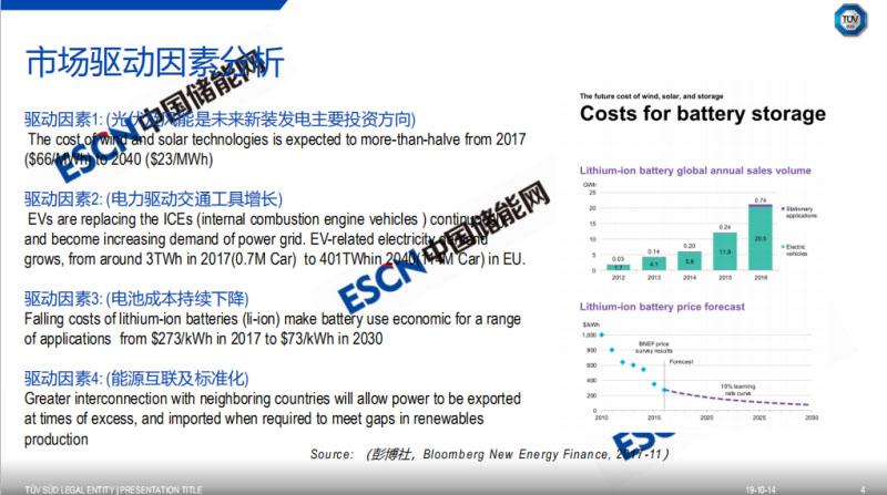 儲能為什么蓬勃發(fā)展?也給大家一個信心,我這邊講了四個驅(qū)動因素:一是光伏和風能是未來新裝發(fā)電的投資方向。以前講平價上網(wǎng),光伏已經(jīng)達到了這個水準,光伏未來是必須這樣應用的,電力驅(qū)動,國內(nèi)和國外都在講電動車,對電力、電能的需求是非常大的。不管是家庭還是電網(wǎng)級的應用,如果成本下不來,現(xiàn)在沒辦法和傳統(tǒng)的發(fā)電競爭,電池的成本持續(xù)下降,給儲能產(chǎn)業(yè)的驅(qū)動是最重要的。前面的各種因素都在驅(qū)動的情況下,如果沒有標準的情況下,儲能要達到大規(guī)模應用是不太可能的,這是我對產(chǎn)業(yè)的一些理解。