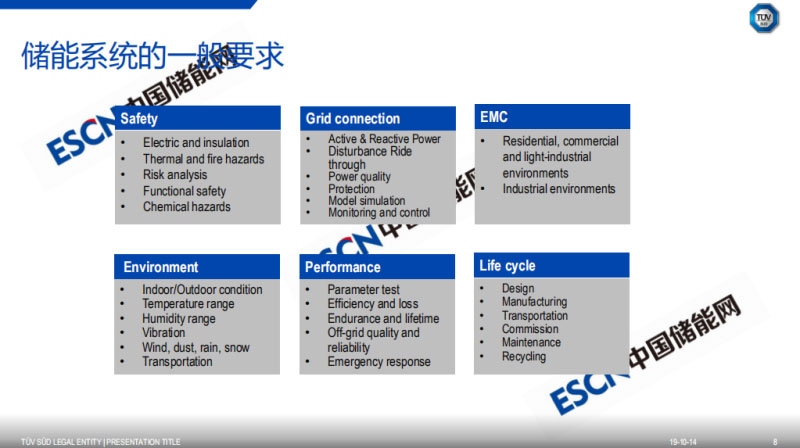 以上事件都面臨標準化的問題。韓國現(xiàn)在面臨最大的問題是起火以后能否滿足安全的需求?他們需要有一個成熟的標準,他們引用一些IEC62933-5-2,雖然目前此標準仍然在草稿版審批中。現(xiàn)在做儲能肯定要并網(wǎng),大規(guī)模并網(wǎng)以后,要求變得更高,由低到高會有更多細化的要求。大型的電站,例如現(xiàn)在澳洲大規(guī)模的電站要求建模。