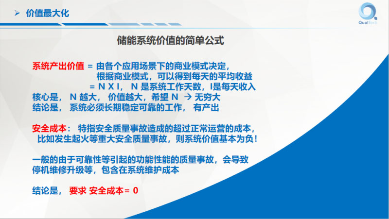 今天重點(diǎn)講的是價(jià)值,儲(chǔ)能系統(tǒng)的價(jià)值=系統(tǒng)持續(xù)產(chǎn)出部分-初始投資-系統(tǒng)運(yùn)營(yíng)成本-安全成本。系統(tǒng)產(chǎn)出價(jià)值可以隨著時(shí)間不斷積累增加。安全成本開(kāi)始可能不發(fā)生,隨著時(shí)間的推移不斷的累積,直到某一天直接爆發(fā)。運(yùn)營(yíng)成本的大小可以通過(guò)我們的努力不斷降低。