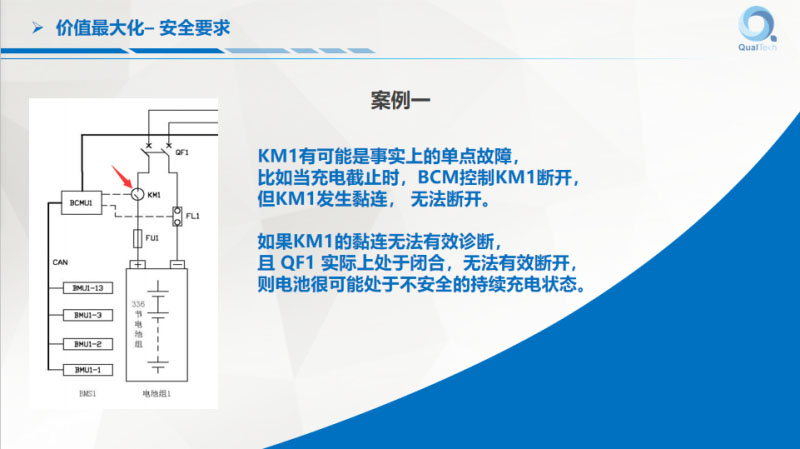 講幾個(gè)簡(jiǎn)單案例,儲(chǔ)能系統(tǒng)里的一個(gè)簇,比如說(shuō)上面寫著電池,我們看一下KM1繼電器,它可能存在單點(diǎn)故障,BMS充電需要截止,要把繼電器斷開(kāi),繼電器不是百分之百斷開(kāi),可能粘連了就無(wú)法斷開(kāi)。無(wú)法斷開(kāi)怎么辦?得想辦法知道粘連了,才會(huì)有對(duì)策。有些情況下可能檢測(cè)不出來(lái),這就沒(méi)辦法。QF一般是斷路器,斷路器一般不太經(jīng)常的開(kāi)關(guān),斷路器一般都是處于閉合狀態(tài),當(dāng)QF1一旦粘連,如果沒(méi)有辦法診斷,就可能繼續(xù)充電。整個(gè)系統(tǒng)可能有很多,其他的還在充電,這個(gè)簇可能還在繼續(xù)充電,過(guò)了一段時(shí)間可能出現(xiàn)過(guò)壓的問(wèn)題,時(shí)間長(zhǎng)了電池就有問(wèn)題了。