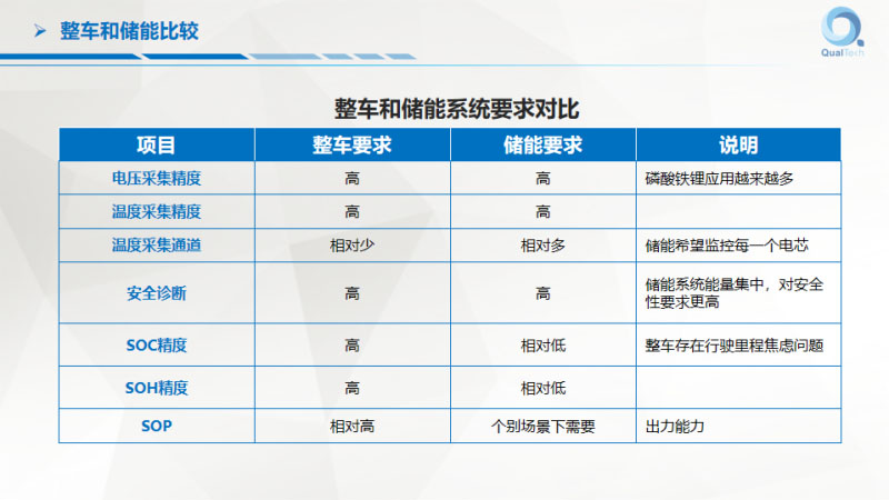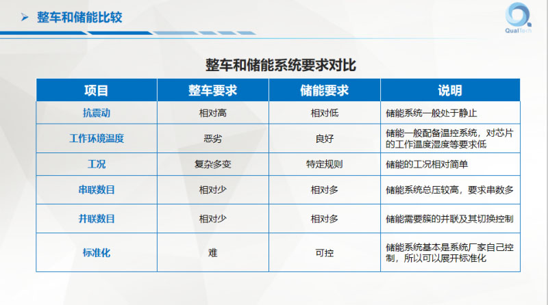 整車的BMS和儲(chǔ)能的BMS到底有什么區(qū)別?本來(lái)想在這里多講一下,沒(méi)有多少時(shí)間我過(guò)一下。整車和儲(chǔ)能相比,我的結(jié)論是儲(chǔ)能的要求跟汽車差不多,后果比汽車更嚴(yán)重,一定要以汽車級(jí)的電池管理進(jìn)行開(kāi)發(fā),16949和ISO的指導(dǎo)下進(jìn)行儲(chǔ)能系統(tǒng)的設(shè)計(jì),才可以在方法和體系上保障它的安全、可靠的級(jí)別。不是一般的、隨便搞兩下。