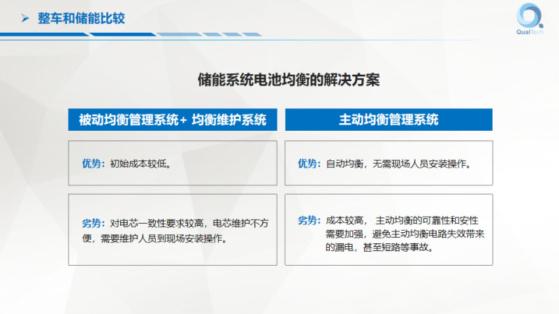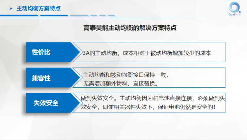 運(yùn)營(yíng)效率今天沒(méi)時(shí)間了,包括BMS廠家、包括PCS廠家,大家怎么把這個(gè)系統(tǒng)做得效率高?這是BMS的核心功能(見(jiàn)PPT)、這是我們做的主動(dòng)均衡方案介紹(見(jiàn)PPT),剛才講到失效的分析,我們提供的主動(dòng)均衡解決方案解決了失效安全的問(wèn)題,我們可以避免剛才說(shuō)的這些問(wèn)題,確保在電池端不會(huì)發(fā)生短路。