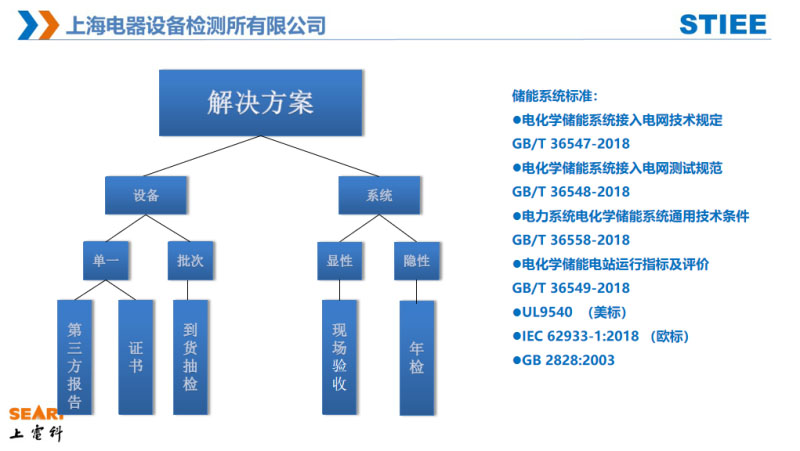 由于儲能電站應(yīng)用越來越廣,國家也出臺一系列的標(biāo)準(zhǔn),國內(nèi)已經(jīng)推出GB/T 36548、GB/T36558等一系列的標(biāo)準(zhǔn),對儲能電站接入電網(wǎng)有一些要求。歐美有UL9540和IEC62933等標(biāo)準(zhǔn)。針對單一設(shè)備我們可以做到第三方報告和證書,批次設(shè)備可以根據(jù)GB/T2828進行到貨抽檢,一些儲能電站剛開始沒有發(fā)現(xiàn)問題,但是運行到一定時間可能會產(chǎn)生一些安全上的隱患,預(yù)防性的年檢也是必不可少的。