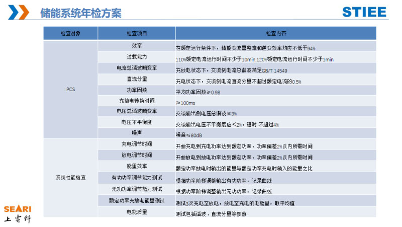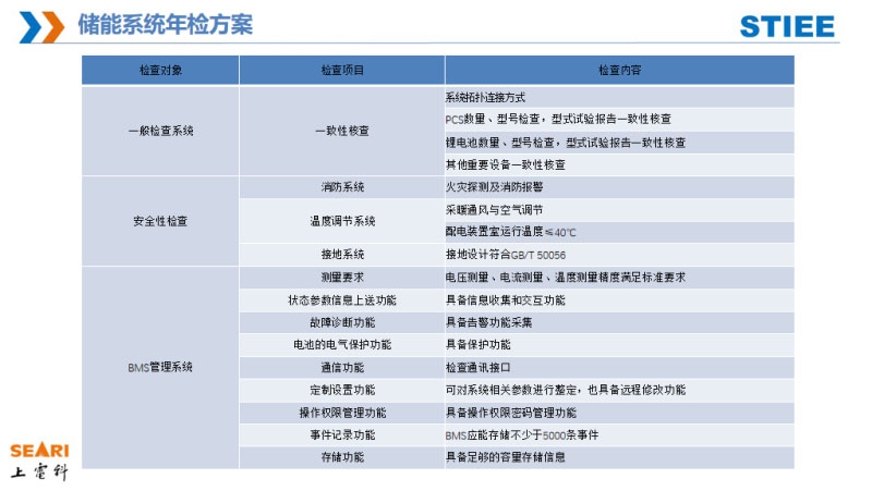 這是我們儲能系統(tǒng)電站的現(xiàn)場年檢方案,包括一致性檢查、安全性檢查、設(shè)備檢查、系統(tǒng)性檢查。安全性的檢查考慮安全系統(tǒng)、溫控、接地是否與設(shè)計符合。BMS根據(jù)GB/T34131標(biāo)準(zhǔn)進行驗收,如故障診斷、通信等。系統(tǒng)性的檢查主要是有功、無功、電網(wǎng)性的測試項目還有一些高低穿的測試項目。