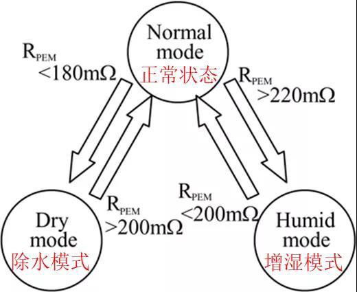 用A、B、C、D四個(gè)點(diǎn)將圖1中曲線分成三段,AB段代表燃料電池單片水含量過低,CD段代表燃料電池單片水含量過高,無(wú)論燃料電池單片水含量過高或過低都將導(dǎo)致燃料電池輸出性能下降(上圖所示),中間BC段代表燃料電池水含量和輸出性能變化是有邊界的。豐田實(shí)驗(yàn)數(shù)據(jù)表明,BC段是一定存在的,其存在的意義是燃料電池系統(tǒng)水管理策略的實(shí)時(shí)性要求有所降低,同時(shí)B點(diǎn)和C點(diǎn)的選擇是有依據(jù)的,至少有四個(gè)方面:第一,B點(diǎn)和C點(diǎn)的燃料電池輸出電壓是相近的;第二,B點(diǎn)與C點(diǎn)之間的燃料電池阻抗變化必須是可測(cè)量的且可有效區(qū)分的;第三,B點(diǎn)和C點(diǎn)之間的燃料電池工作條件控制是易于實(shí)現(xiàn)的;第四,B點(diǎn)和C點(diǎn)之間的燃料電池水含量變化對(duì)耐久性的損傷是較弱的,比如質(zhì)子交換膜膨脹率、膜電極電流和溫度分布均勻性。