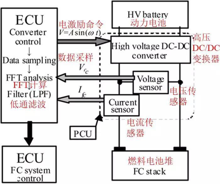 下圖為豐田燃料電池系統(tǒng)交流阻抗測(cè)量技術(shù)原理。從電氣配置角度講,具備高壓DC/DC變換器、電流傳感器、電壓傳感器。其中,高壓DC/DC變換器與燃料電池堆正負(fù)極相連,用于對(duì)燃料電池堆施加電激勵(lì)信號(hào);電流傳感器用于測(cè)量燃料電池堆的輸出電流;電壓傳感器用于測(cè)量燃料電池堆的輸出電壓。盡管豐田MIRAI燃料電池動(dòng)力系統(tǒng)構(gòu)型與下圖有差異,但對(duì)燃料電池堆施加電激勵(lì)信號(hào)均為DC/DC變換器,只是DC/DC變換器主要服務(wù)對(duì)象從動(dòng)力電池?fù)Q成了燃料電池,在此不作區(qū)分。