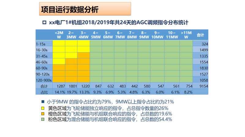 基于數(shù)據(jù),我們做了一些深入的統(tǒng)計(jì)分析,小于9MW的指令大概有79%,9MW以上的有21%,不同的顏色代表不同的技術(shù)區(qū)域。黃色區(qū)域單獨(dú)采用飛輪儲(chǔ)能的技術(shù),占總指令數(shù)量的26%。橙色區(qū)域使用飛輪儲(chǔ)能與機(jī)組聯(lián)合響應(yīng)的調(diào)節(jié)指令,占總數(shù)19.6%,大家不要小看火電機(jī)組和燃?xì)鈾C(jī)組的能力,在自身的基礎(chǔ)上再疊加混合儲(chǔ)能系統(tǒng),最后的調(diào)節(jié)性能更好。有一些火電廠,做了儲(chǔ)能調(diào)頻的技術(shù)改造,但K值提高并不多,原因是機(jī)組不夠優(yōu)化。粉色區(qū)域?yàn)榛旌蟽?chǔ)能與機(jī)組聯(lián)合響應(yīng)的指令,占總指令數(shù)的54.4%。