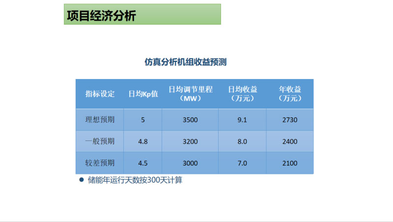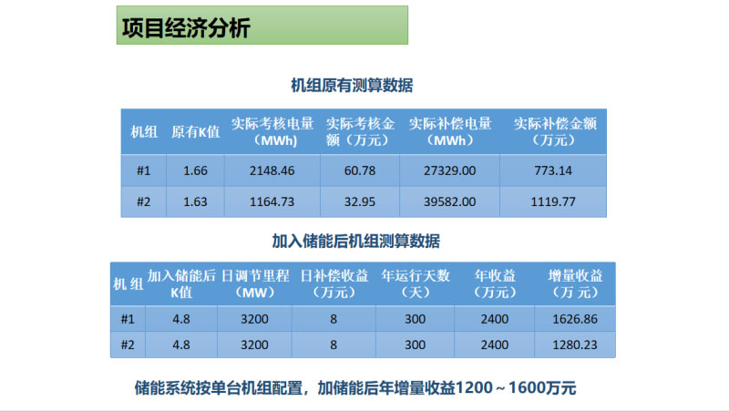 最后在經(jīng)濟(jì)性方面,系統(tǒng)總體的造價(jià)大概是4000萬(wàn)左右,現(xiàn)在有可能高、有可能低,一些配件價(jià)格是在波動(dòng)的。上面的計(jì)算表格是沒(méi)加入混合儲(chǔ)能的測(cè)算情況,下面的是加入混合儲(chǔ)能的情況,加入混合儲(chǔ)能以后,每年的增量收益在1200到1600萬(wàn)左右。