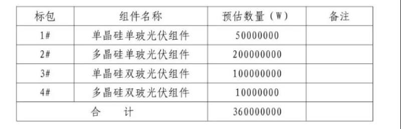 本招標(biāo)項(xiàng)目劃分為四個(gè)標(biāo)段,預(yù)估總采購數(shù)量為360MW,其中單晶硅單玻光伏組件50MW,多晶硅單玻光伏組件200MW,單晶硅雙玻光伏組件100MW,多晶硅雙玻光伏組件10MW。潛在投標(biāo)人可以對(duì)某一標(biāo)段或全部標(biāo)段進(jìn)行投標(biāo),兼投兼中。