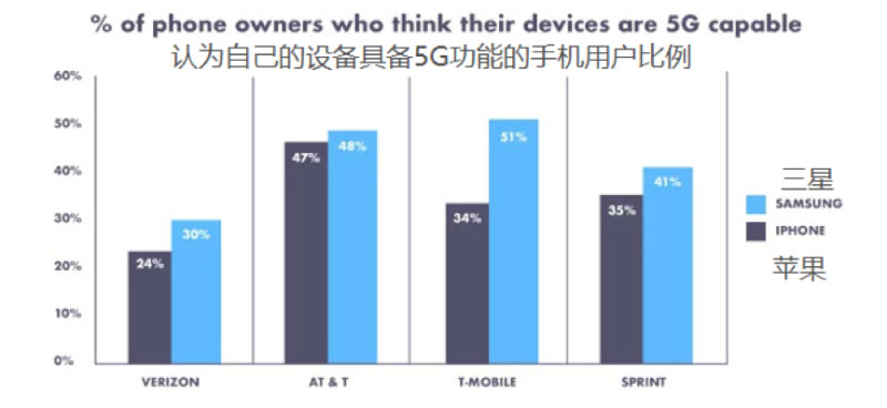 而在美國,只有64%受訪者聽說過5G,而且不認為5G比快充、無線充電甚至防水功能更重要。在另一份來自美國二手電子設備平臺Decluttr的用戶調研中,給出了更令人瞠目結舌的結果:高達24-51%用戶認為自己手上的三星或蘋果手機已經支持了5G網絡——當然這是不可能的。