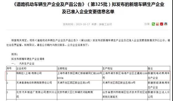 10月17日,工信部發(fā)布第325批《道路機動車輛生產(chǎn)企業(yè)及產(chǎn)品公告》擬發(fā)布的新增車輛生產(chǎn)企業(yè),特斯拉(上海)有限公司出現(xiàn)在該名單中,并備注為“新建純電動乘用車生產(chǎn)企業(yè)”。公示時間10月17日至10月23日。