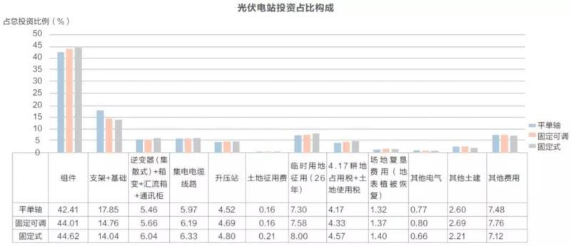 在實際項目中,將光伏電站在固定式、固定可調(diào)式、平單軸三種運行方式下的設(shè)計概算進(jìn)行分析,將各部分的投資占比整理如圖所示。