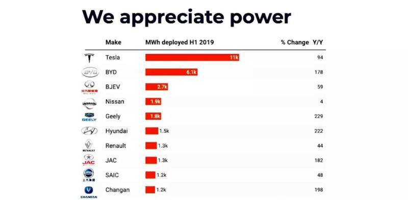 據(jù)AdamasIntelligence發(fā)布的最新電動車市場調(diào)查報告顯示,2019年上半年產(chǎn)的新能源乘用車中裝載的電池總容量為46.3 GWh,特斯拉以11 GWh的裝機量排名第一。
