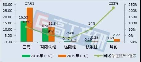 根據(jù)合格證數(shù)據(jù)口徑計(jì)算,2019年1-9月新能源汽車動(dòng)力電池裝機(jī)量42.31GWh,同比增長47%。其中,三元?jiǎng)恿﹄姵匮b機(jī)量27.61GWh,同比增長67%,占總裝機(jī)量的65.25%,較去年同期占比上升7.80%;磷酸鐵鋰動(dòng)力電池裝機(jī)量11.84GWh,同比增長9%,占總裝機(jī)量的27.98%,較去年同期占比下降9.88%;錳酸鋰動(dòng)力電池裝機(jī)量0.36GWh,同比下降24%,占總裝機(jī)量的0.85%,較去年同期占比下降0.79%;鈦酸鋰動(dòng)力電池裝機(jī)量0.29GWh,同比增長54%,占總裝機(jī)量的0.68%,較去年同期占比上升0.03%;其他未注明具體電池類型的鋰離子動(dòng)力電池裝機(jī)量2.22GWh。