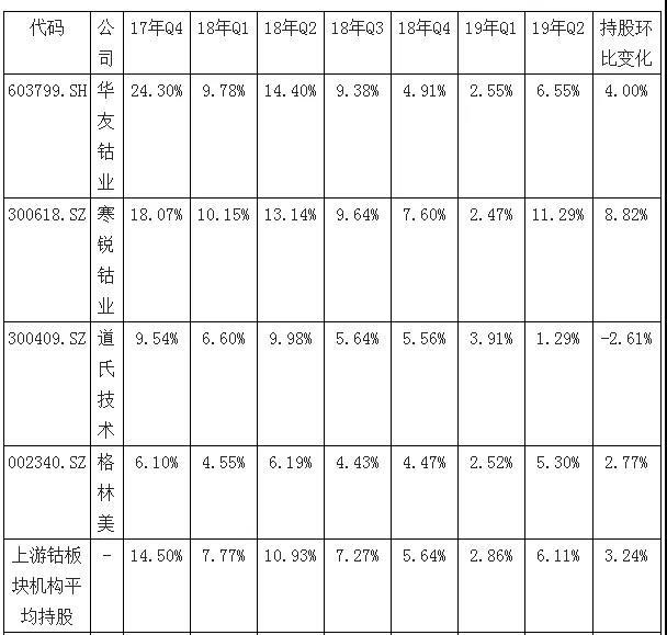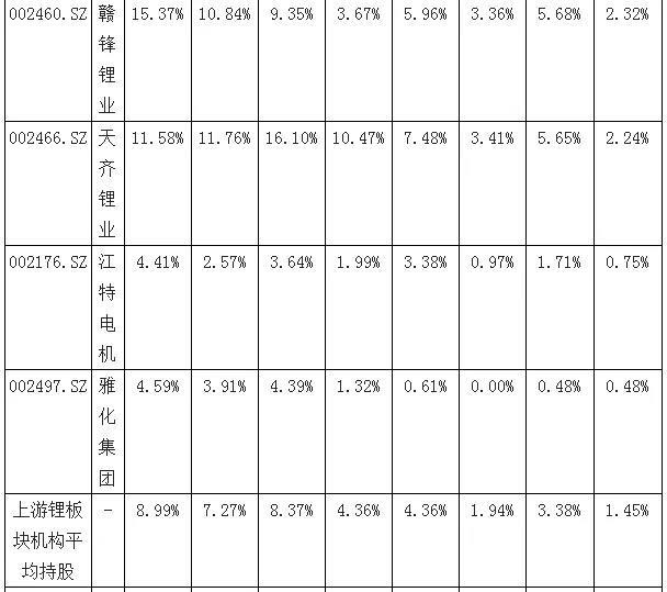 上游鋰鈷板塊,四大鈷企業(yè)公募基金十大重倉股平均持倉由18年4季度的5.6%降至1季度的2.9%,2季度增至6.1%,而四大鋰企業(yè)由1季度的1.9%增至3.4%。