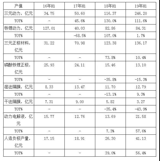 一、2019年H1各板塊產(chǎn)值:三元動力電池、人造負極、電解液漲幅居前