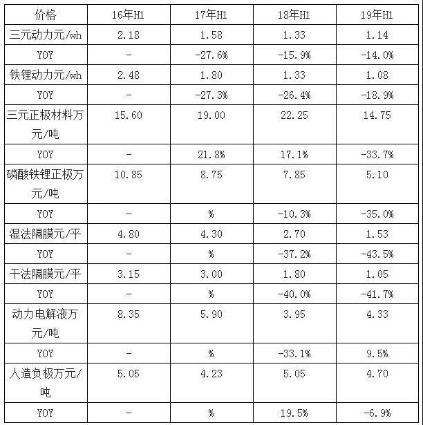 根據(jù)相關(guān)數(shù)據(jù),19年上半年除電解液外,價格均有下降;電解液上半年價格平均為4.33萬元/噸,同比增長9.5%,電解液漲價主要是因為原材料EC價格大幅上漲所致。