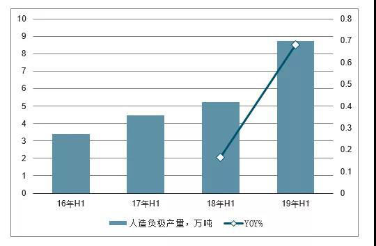 2)以量補價,產(chǎn)值大幅增長。主要是三元動力電池及人造石墨負極,主要是因為量的增速高于電池價格的降速,產(chǎn)值增速為正,19年上半年三元動力電池產(chǎn)值246.20億元,同比增長111.6%,人造石墨負極產(chǎn)值41.13億元,同比增長56.4%。