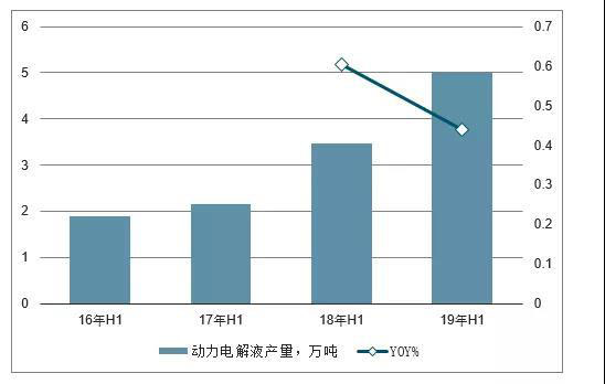 1)量增價穩(wěn),產(chǎn)值提升。19年上半年來看鋰電產(chǎn)業(yè)鏈中電解液屬于量增價穩(wěn)的類型,19年上半動力電解液產(chǎn)值21.58億元,同比增長57.6%。