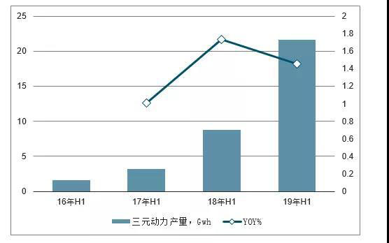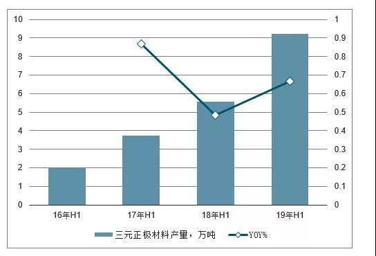 16H1-19H1三元正極材料產(chǎn)量及增長