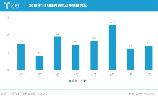 2019年1-8月,國內汽車總體銷量為1610.4萬輛,同比下降11%。其中,純電動車銷量為62.9萬輛,在7月補貼滑坡后遭遇斷崖式下跌。