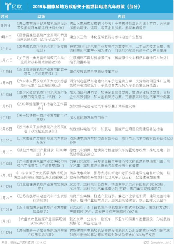 政策支持也是車企加注氫燃料電池汽車的重要原因,2019年以來,全國各地氫燃料電池汽車政策經億歐汽車整理如下。
