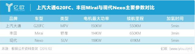 2019年上海車展上,上汽大通氫燃料電池乘用車G20FC亮相,其電機最高功率達150 kw,可實現(xiàn)5分鐘內加氫和零下30℃冷啟動,NEDC綜合工況續(xù)航里程高達550km,各項參數不輸日韓主流競品。