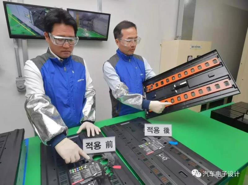 首先是在電池模組的安全隔離方面,三星SDI在新模塊上添加了阻滯劑。含有兩種由特殊化學物質(zhì)組成的橙色阻滯劑是其特殊滅火系統(tǒng)的一部分,可以阻止電芯受損后起火。