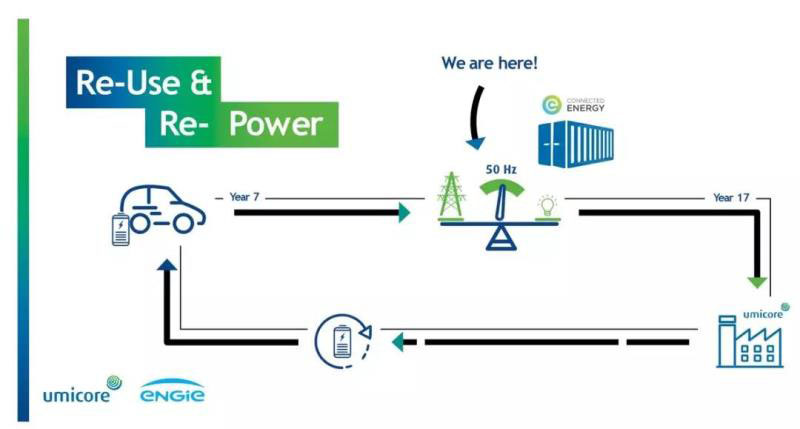中國儲(chǔ)能網(wǎng)訊:法國能源服務(wù)公司ENGIE公司與電池回收公司Umicore公司合作,在比利時(shí)奧倫(Olen)的一個(gè)工業(yè)現(xiàn)場建成首個(gè)“第二次使用”電池儲(chǔ)能系統(tǒng)。該系統(tǒng)由48輛雷諾電動(dòng)汽車已經(jīng)使用7年的鋰電池組成,構(gòu)成了1.2 MW或720 kWh的大型蓄電系統(tǒng)。舊電池的原始儲(chǔ)能量為每塊電池22 kWh,在“第二次使用”應(yīng)用中,每塊電池仍然具有15-17 kWh儲(chǔ)能量,作為為電網(wǎng)服務(wù)的儲(chǔ)能電池仍可以使用10年。