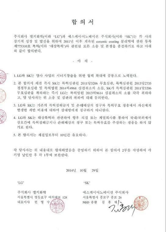 根據(jù)該協(xié)議,SK 撤銷知識(shí)產(chǎn)權(quán)審理與上訴委員會(huì) (IPT) 2011DANG3206號(hào)專利無效案件、有關(guān)2013DANG2735號(hào) IPT 專利補(bǔ)正裁定的無效上訴和2014HEO4968號(hào)專利法院審判撤銷訴訟, LG 則撤銷2013HEO9614號(hào)專利法院審判撤銷訴訟。雙方同意放棄上述訴訟和審判撤銷訴訟。