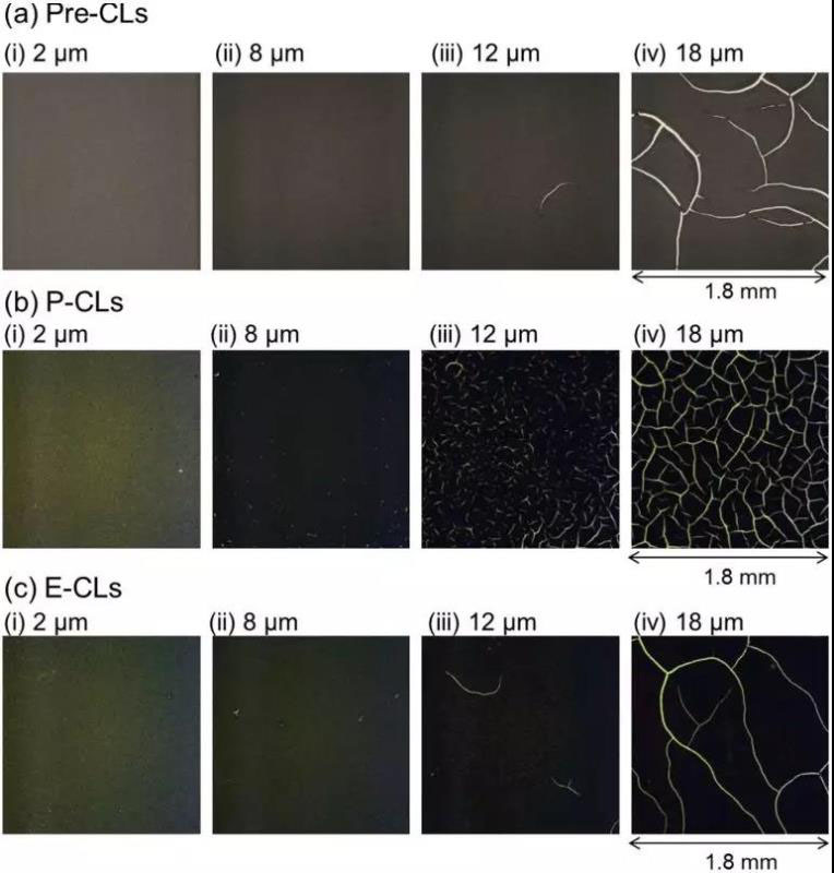 初級(jí)孔大小和數(shù)量變化與應(yīng)力導(dǎo)致的裂縫密切相關(guān)。毛細(xì)壓力在結(jié)構(gòu)化的團(tuán)聚網(wǎng)絡(luò)(structured agglomerate network)上發(fā)展,應(yīng)力則主要是由孔隙中液相的毛細(xì)壓力引起的。溶劑在干燥的早期階段蒸發(fā),而水在干燥結(jié)束階段仍殘留。因此,可以認(rèn)為干燥結(jié)束時(shí)E-ink和P-ink漿料的表面張力相近。通過(guò)水銀孔隙率法觀察到P-CLs中有較小的多孔結(jié)構(gòu),表明較高的毛細(xì)壓力和較大應(yīng)變引起的應(yīng)力會(huì)導(dǎo)致裂紋產(chǎn)生。