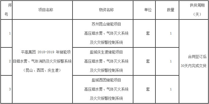 中國(guó)儲(chǔ)能網(wǎng)訊:平高集團(tuán)江蘇昆山、西團(tuán)、慶生渡儲(chǔ)能項(xiàng)目采購(gòu)儲(chǔ)能消防系統(tǒng),要求應(yīng)答人須提供2016年以來(lái)至少1份國(guó)內(nèi)類(lèi)似(高壓細(xì)水霧)工程項(xiàng)目的業(yè)績(jī)合同。詳細(xì)如下: