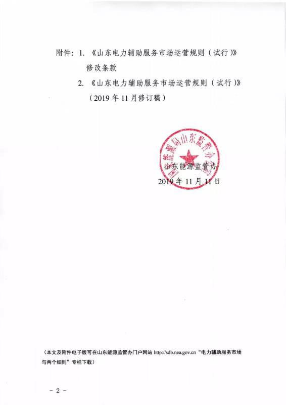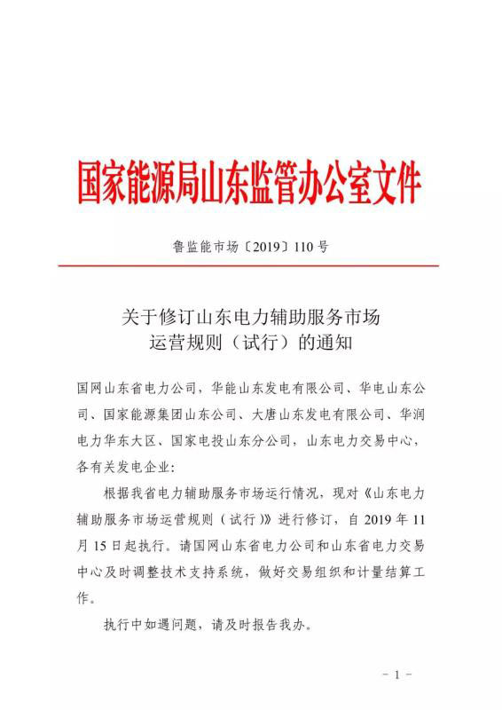 11月11日,山東能監(jiān)辦印發(fā)《山東電力輔助服務(wù)市場運(yùn)營規(guī)則(試行)》2019年11月修訂稿,修訂版本的運(yùn)營規(guī)則將于11月15日起正式執(zhí)行。