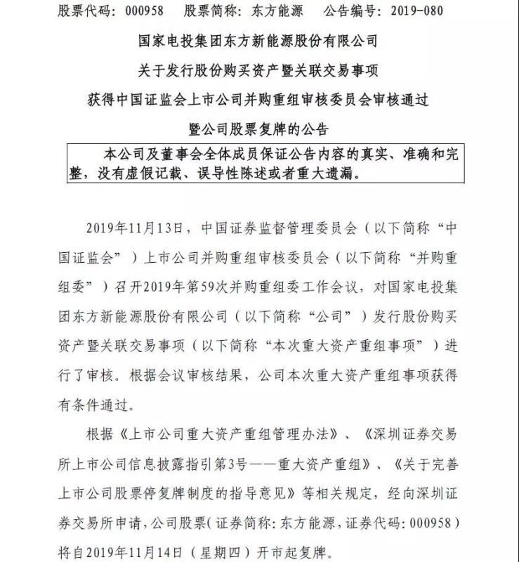 中國儲(chǔ)能網(wǎng)訊:11月13日,中國證監(jiān)會(huì)上市公司并購重組審核委員會(huì)召開2019年第59次并購重組委工作會(huì)議,對(duì)國家電投集團(tuán)東方新能源股份有限公司發(fā)行股份購買資產(chǎn)暨關(guān)聯(lián)交易事項(xiàng)進(jìn)行了審核。根據(jù)會(huì)議審核結(jié)果,此次重大資產(chǎn)重組事項(xiàng)獲得有條件通過。