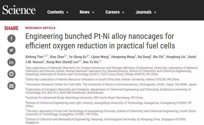 2019年11月15日,國(guó)際頂級(jí)學(xué)術(shù)期刊《Science》以研究長(zhǎng)文形式刊發(fā)華中科技大學(xué)化學(xué)與化工學(xué)院夏寶玉教授團(tuán)隊(duì)的最新研究成果《Engineering bunched Pt-Ni alloy nanocages for efficient oxygen reduction in practical fuel cells》。該文闡述了夏寶玉教授團(tuán)隊(duì)在高效長(zhǎng)壽命鉑合金催化劑的最新研究進(jìn)展:采用(電)化學(xué)腐蝕方法對(duì)鉑基催化劑的近表面結(jié)構(gòu)和組分進(jìn)行調(diào)控,大幅提升高效鉑鎳合金催化劑在實(shí)際燃料電池器件中的耐久性,有望成為發(fā)展燃料電池行之有效的關(guān)鍵手段。