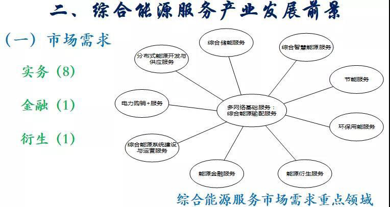 可以預見,綜合能源服務的市場需求將是巨大的,需求的重點領域可以體現在綜合能源系統建設與運營服務、電力購銷+服務、分布式能源開發(fā)與供應服務、綜合儲能服務、綜合智慧能源服務、節(jié)能服務、環(huán)保用能服務、能源銜生服務、能源金融等方面。