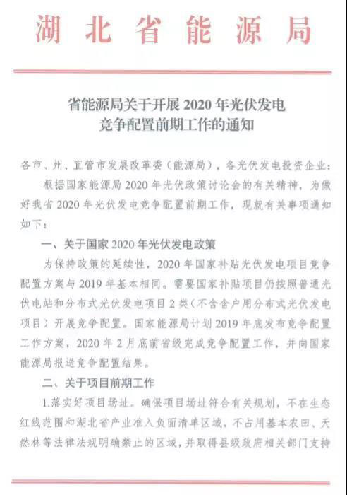 近日,湖北省能源局印發(fā)《關(guān)于開展2020年光伏發(fā)電競(jìng)爭(zhēng)配置前期工作的通知》,通知提到,2020年國(guó)家補(bǔ)貼光伏發(fā)電項(xiàng)目競(jìng)價(jià)方案與2019年基本相同,仍按照普通光伏電站和分布式光伏發(fā)電項(xiàng)目2類(不含戶用分布式)開展競(jìng)爭(zhēng)配置。投資企業(yè)前期工作需落實(shí)好項(xiàng)目場(chǎng)址,及時(shí)辦理項(xiàng)目備案手續(xù),并開展電力接入和消納論證以確保項(xiàng)目具備接入和消納的條件。
